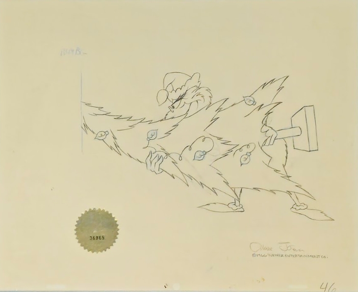 This is an original production drawing used in making "How The Grinch Stole Christmas" 1966. Featured here is The Grinch. This has been signed by the late Chuck Jones. Unframed only.