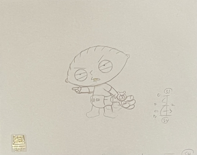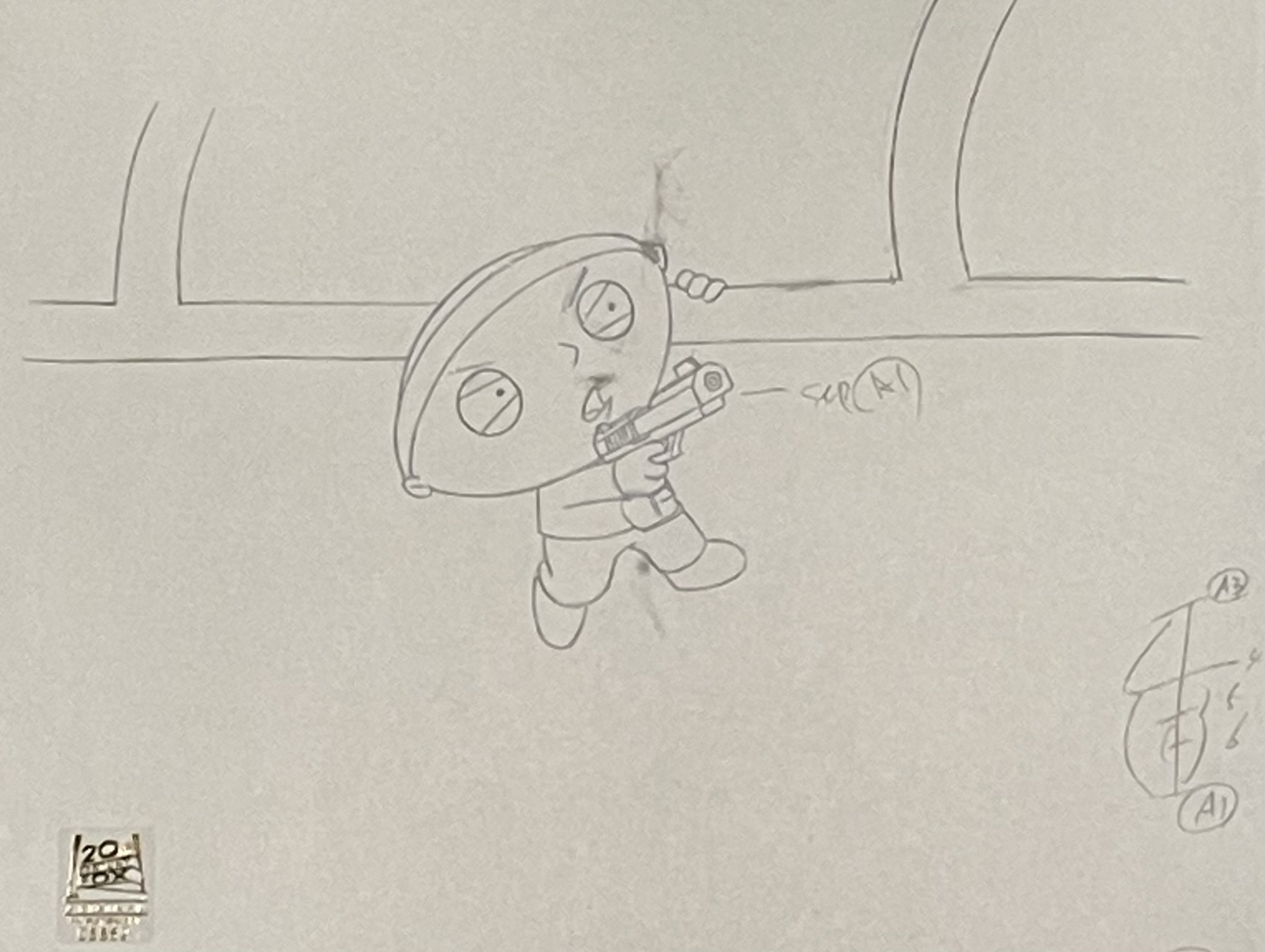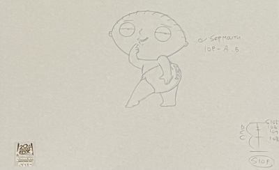 This is an original production drawing used in making an episode of "Family Guy". Episode title "Brian Does Hollywood" July 18, 2001. Featured here is Stewie Griffin.