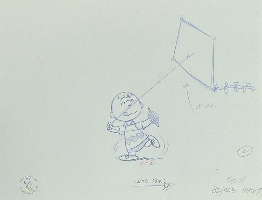 This is an original production drawing featuring Charlie Brown flying a kite.
