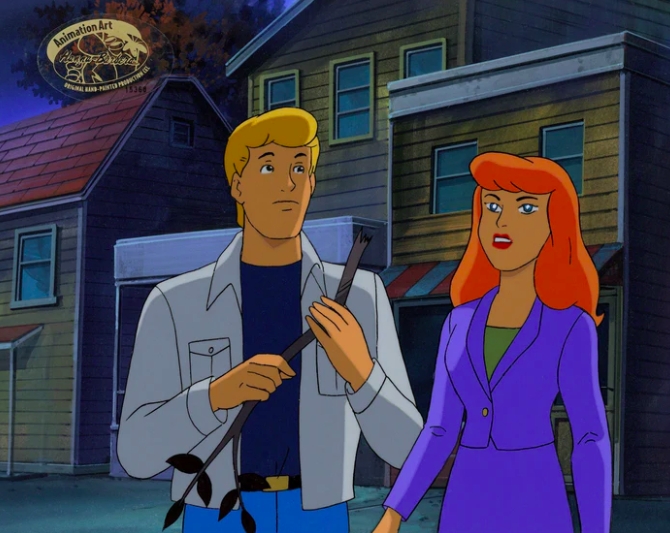This is an original hand painted production cel on original production background. This was used in making "Scooby Doo and the Witches Ghost" 1999. Featured here are Fred and Daphne.