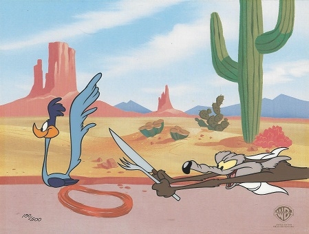 This is a hand painted limited edition cel. Drawn by Carrell Van Citters and features Wile E. Coyote and Road Runner. A classic Warner Bros. duo. This piece is slightly smaller than an average cel but the image quality is superior.395