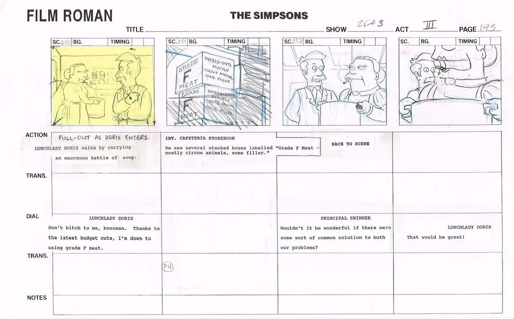 This is a rare original storyboard used in making "The Simpsons". Storyboards are where animation is created. Story lines, dialogue, action, settings, everything comes together at this crucial juncture before being passed on to the animation team to bring it to life. Storyboards are where the magic happens, and where animation directors do their most important work. What they lack in color and immediate visual impact, they more than make up for in rarity and creative authenticity. Storyboards are an important component of a serious animation art collection. This storyboard was used in making episode AABF01 "Treehouse of Horror V" October 30, 1994. Featured here is Principle Skinner and Lunch Lady Doris.