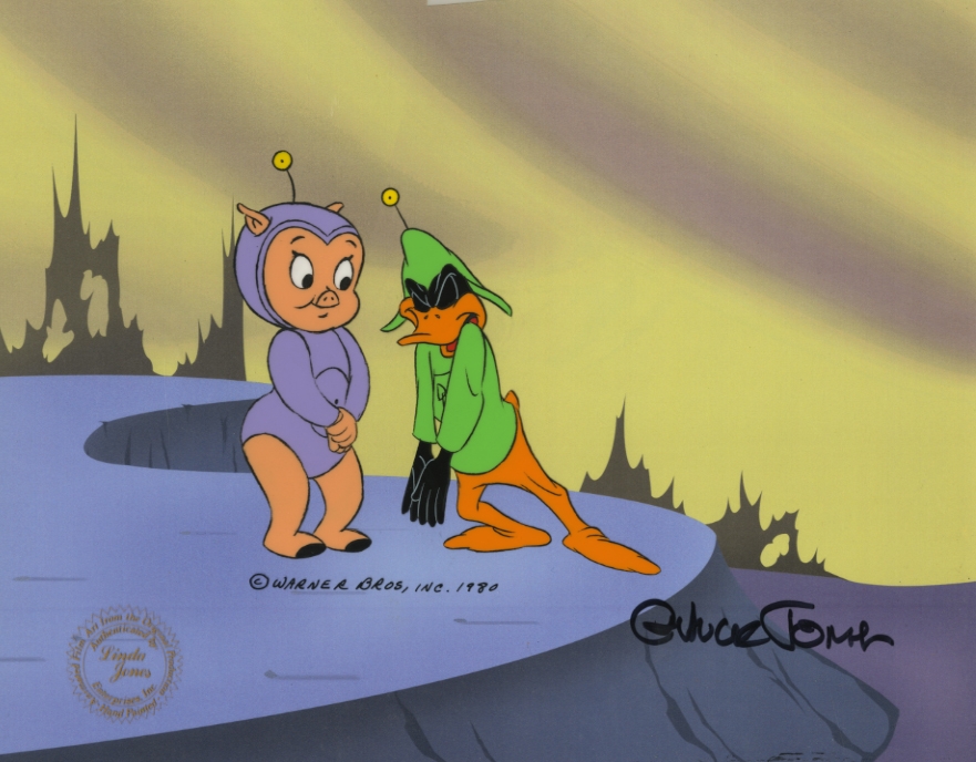 This is an original hand painted production cel used in making "Duck Dodgers and the Return of the 24th 1/2 Century" 1980. Featured here are Porky Pig and Daffy Duck. This is signed by the late Chuck Jones.