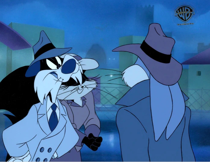 This is an original hand painted production cel of Bugs Bunny, Sylvester and Penelope Pussycat. This was used in making Looney Tunes "Carrotblanca" 1995.