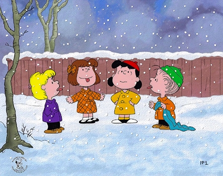 This is a hand painted limited edition cel. In this scene...it's December and Linus thinks that the snowflakes need a bit more sugar while his bossy big sis looks on instructing them that she only eats January Snowflakes. Featured here are Linus, Lucy, Schroeder and Patty.
