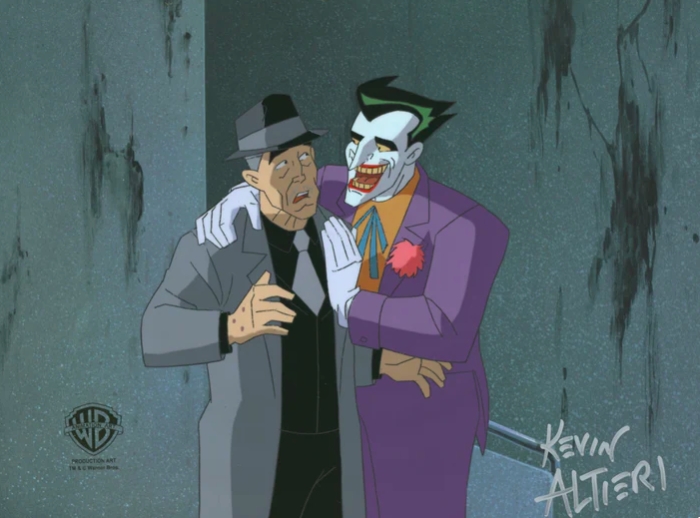 This is an original hand painted production cel used in making "Batman: The Mask of Phantasm" 1993. Featured here are Joker and Salvatore Valestra. This is signed by Kevin Altieri.