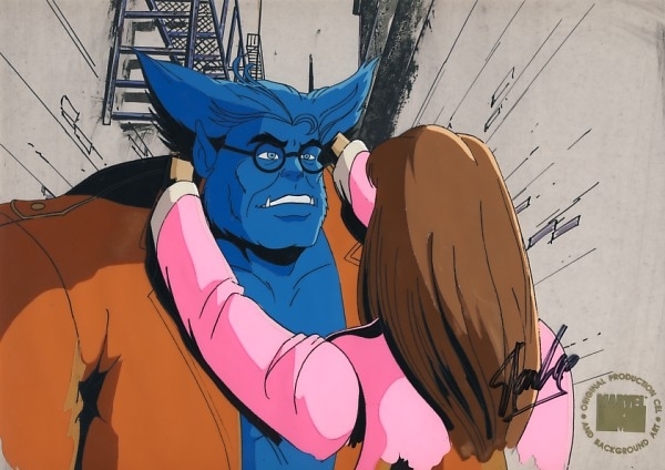 This is an original production cel on production background from X-Men featuring Beast. This is personally signed by Stan Lee.150