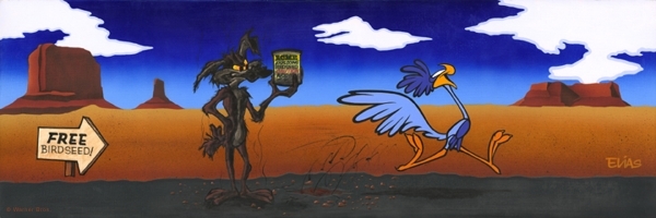 This is a fine art reproduction on canvas by artist Bob Elias. Elias was commissioned by the Chuck Jones Galleries to create work for the Chuck Jones Homage series during this, Jones's Centennial Year. Utilizing the drawings of Chuck Jones as inspiration, Elias has, with his trademark insouciance and sign-painter background, created a memorable moment from the Chuck Jones canon.