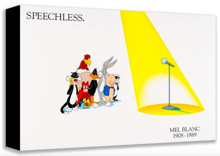 This is an open edition canvas that's ready to hang. Created to honor the passing of legendary voice talent Mel Blanc, featuring Tweety, Sylvester, Foghorn Leghorn, Yosemite Sam, Daffy Duck, Bugs Bunny, Porky Pig and Pepe le Pew. This is the most requested piece of animation artwork! contact us for shipping quote outside North America.